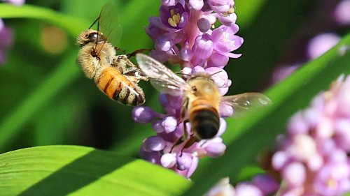 26일 오전 제주 서귀포시 남원읍 휴애리 자연생활공원에서 꿀벌이 맥문동 꽃에서 꿀을 따고 있다. 연합뉴스