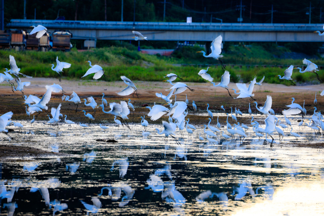26일 경북 울진군 울진읍 도심지를 관통하는 남대천에서 백로 떼들이 현란한 군무를 펼치며 가을을 손짓하고 있다. 사진제공=울진군