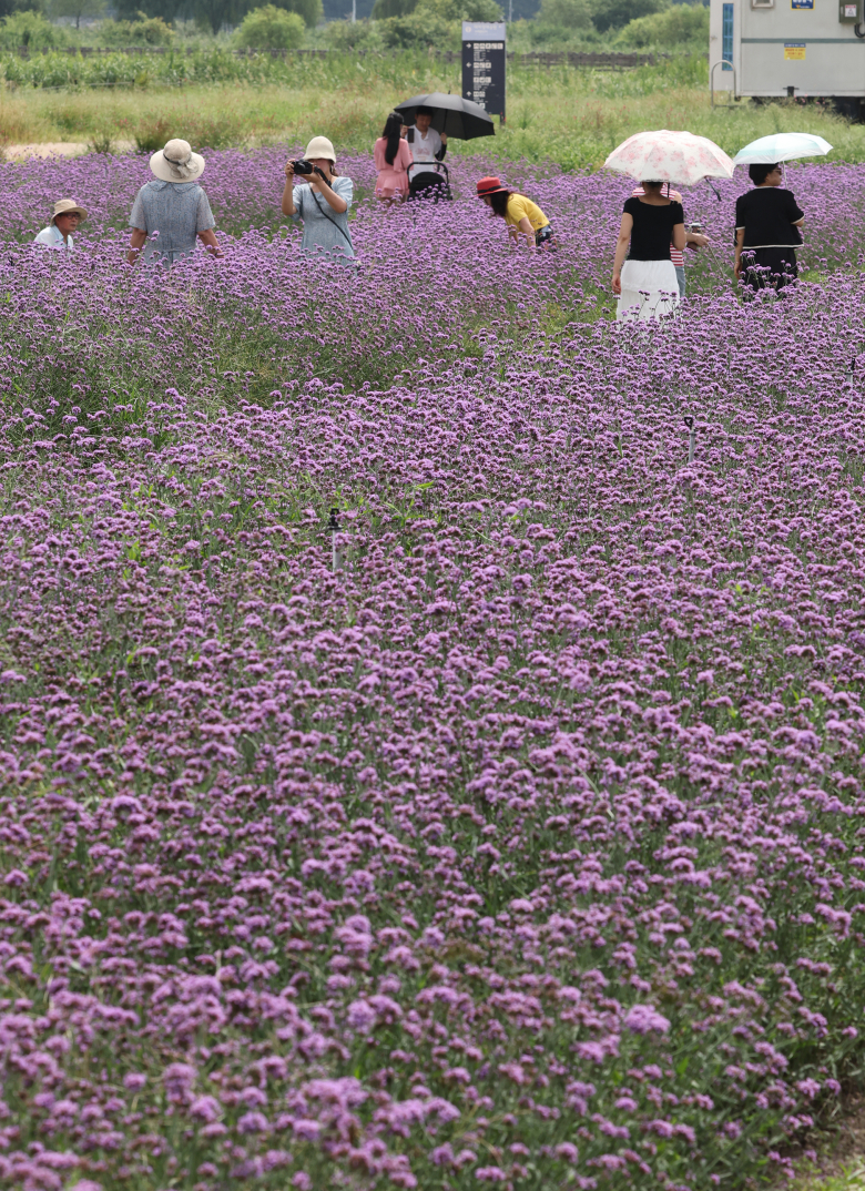 8일 오전 부산 강서구 대저생태공원 버베나 꽃밭에서 나들이 나온 시민들이 활짝 핀 꽃을 감상하며 사진을 찍고 있다. 연합
