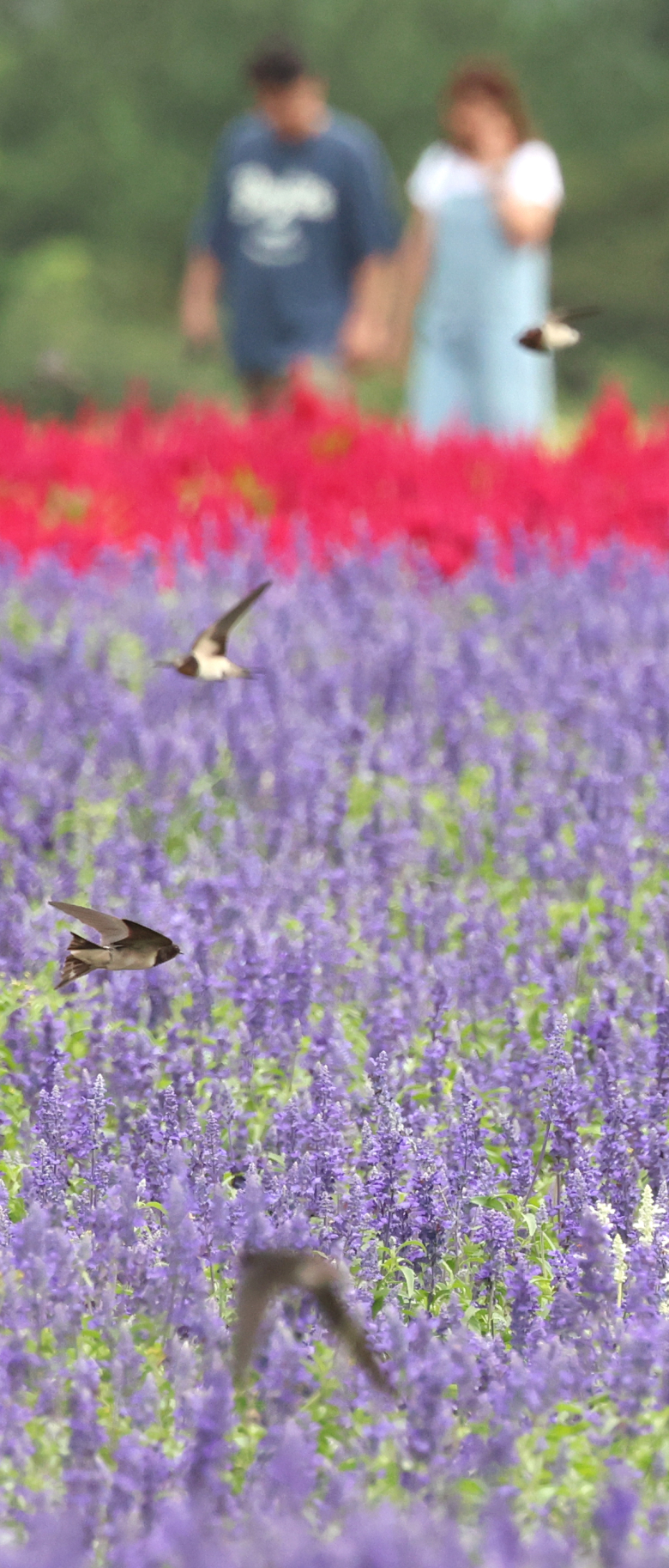9일 제주 서귀포시 표선면 보롬왓농장 꽃밭에서 이동 중인 제비 무리가 먹이활동을 하고 있다. 연합