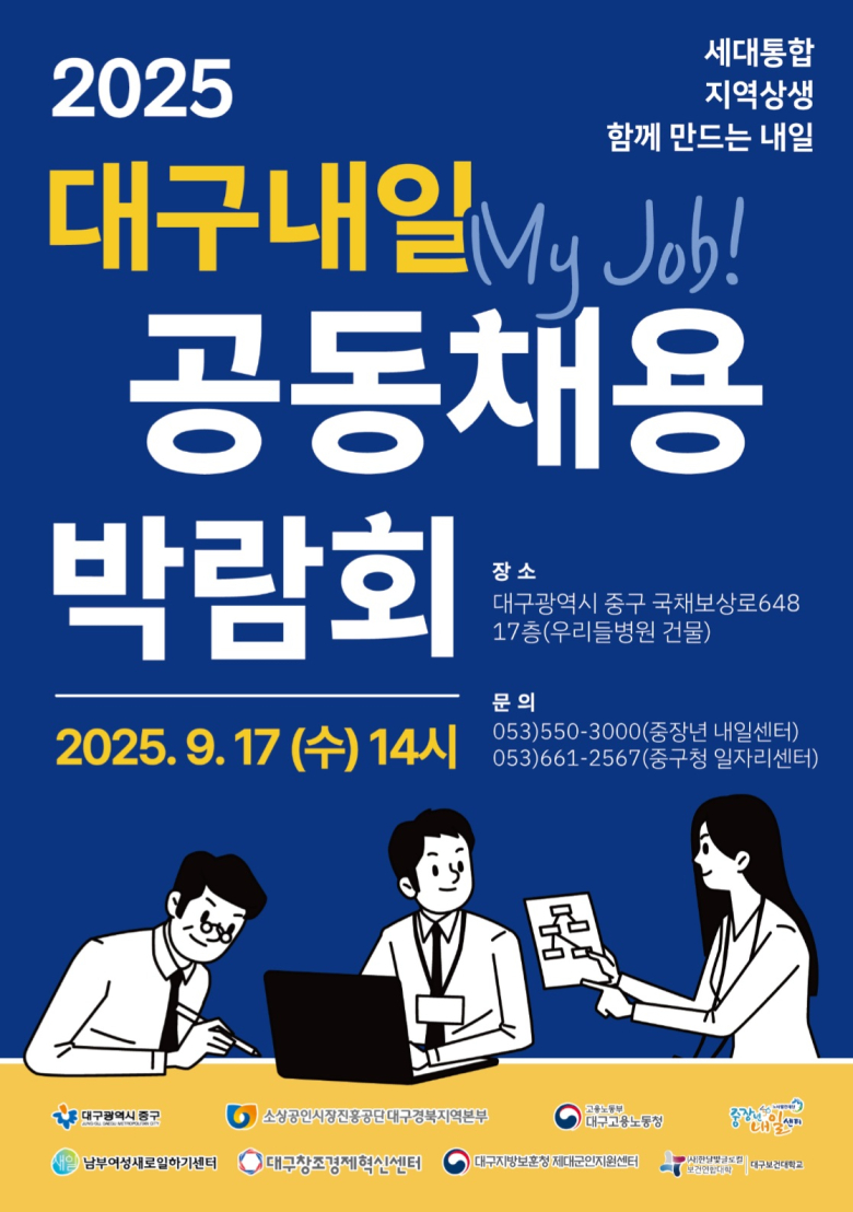 대구 중구가 오는 17일 오후 2시부터 4시까지 우리들병원 17층에서 ‘2025 대구 내일(My Job) 공동채용박람회’를 개최한다.