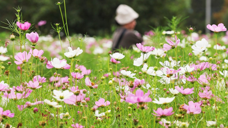 14일 경기도 수원시 권선구 탑동시민농장을 찾은 시민들이 활짝 핀 코스모스를 감상하며 초가을 정취를 느끼고 있다. 연합뉴스