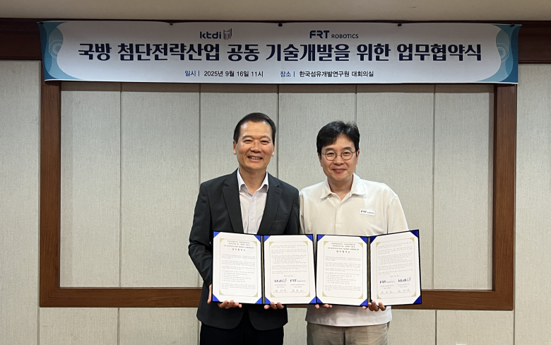 한국섬유개발연구원(이하 KTDI)과 ㈜에프알티로보틱스가 16일 KTDI 대회의실에서 국방 첨단전략산업 분야 공동 기술개발을 위한 업무협약을 체결했다.협약을 통해 양 기관은 ▲국방·소방 분야 로봇 슈트(엑소스켈레톤) 첨단소재 공동 연구, ▲기술개발 및 사업화, ▲인력·정보 교류 및 네트워크 구축 등에서 상호 협력하기로 했다. 특히 방산·안전산업 분야가 요구하는 첨단섬유소재의 기술 자립화와 적용 확대, 전문 인력 양성에 중점을 두고 있다.KTDI는 로봇, 미래 모빌리티, ABB, 바이오 등 미래 신산업과 섬유소재 기술의 융합을 추진 중이다.에프알티로보틱스는 국내 최초로 유압식 웨어러블 로봇을 개발한 기업으로, 방산·안전 산업 분야에서 상용화 성과를 인정받아 방위사업청, 산업통상자원부, 과학기술정보통신부 등으로부터 표창과 혁신상을 수상한 바 있다.김성만 한국섬유개발연구원장은 “첨단 로봇산업 분야의 핵심 부품소재 국산화를 위한 섬유기술 고도화가 중요한 시점”이라며 “에프알티로보틱스와의 전략적 협업을 통해 국가전략기술 실현에 앞장서는 연구기관으로 거듭나겠다”고 말했다.