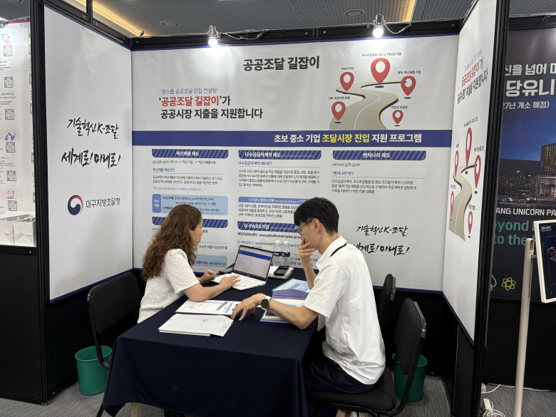 대구지방조달청이 17일과 18일 양일간 열린 ‘2025년 경북 스타트업 투자 매칭데이’ 행사에서 스타트업 기업을 대상으로 공공조달 진입 지원 프로그램을 운영했다.이번 행사에는 경북도와 (재)경북창조경제혁신센터가 주관해 경북 지역 스타트업 118개사가 참여했으며 대구조달청은 ‘공공조달 길잡이’ 제도를 비롯해 벤처나라, 다수공급자계약(MAS), 우수제품, 혁신제품 등 조달시장 진입 제도를 소개했다. 또 입찰참가자격 등록 방법 등 실무 중심 설명회와 1:1 맞춤형 컨설팅을 진행해 호응을 얻었다.‘공공조달 길잡이’는 공공조달에 관심 있는 기업을 발굴해 제도 활용과 시장 진입에 필요한 정보를 원스톱으로 제공하는 제도다.윤경자 대구조달청장은 “스타트업의 성공적인 조달시장 진출이 안정적인 판로 확보로 이어지도록 지속적으로 지원하겠다”며 “앞으로도 맞춤형 컨설팅을 통해 신규 기업들의 공공시장 진입을 적극 돕겠다”고 말했다.