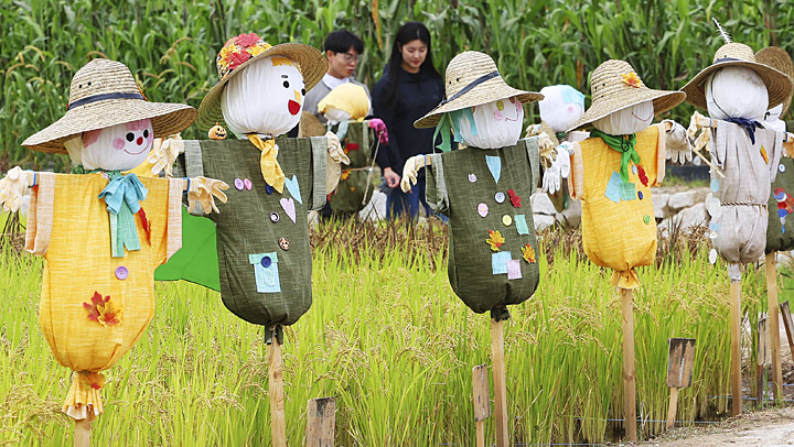 절기상 추분을 하루 앞둔 22일 경기도 수원시 권선구 국립농업박물관에서 누렇게 익어가는 벼 옆에 허수아비가 세워져 있다. 연합뉴스