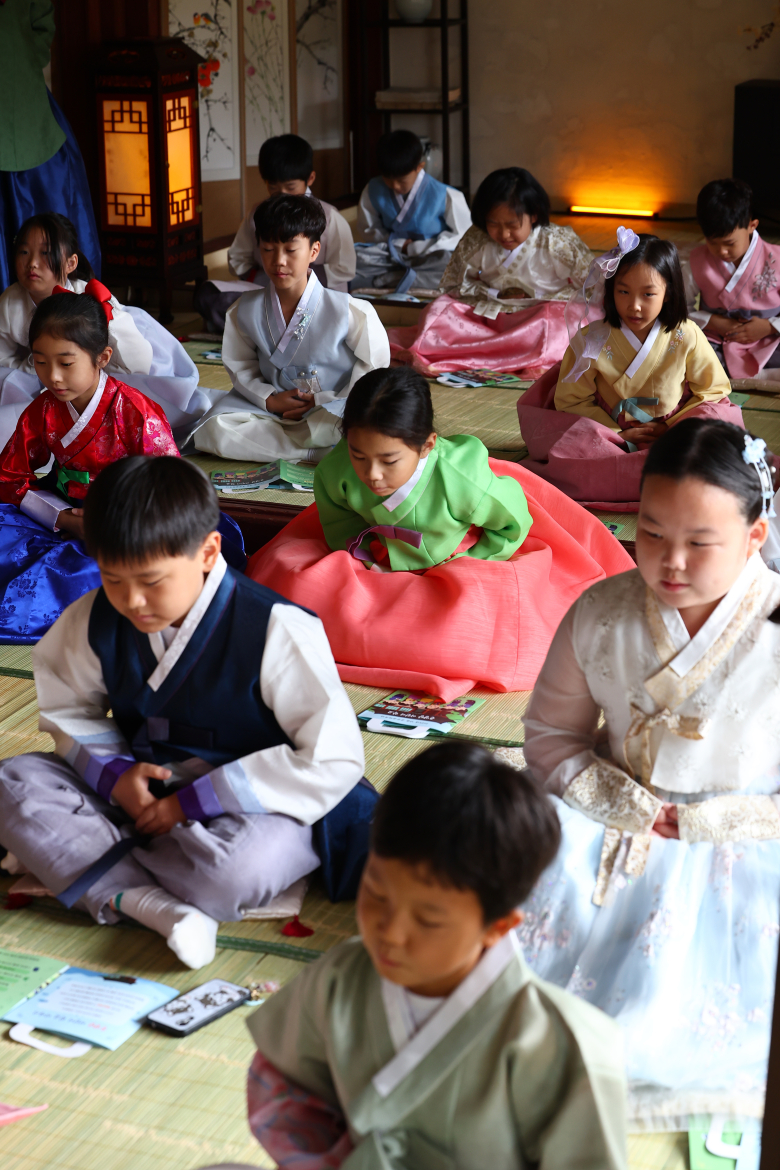 2025 가을 궁중문화축전 마지막 날인 12일 서울 중구 덕수궁 준명당에서 열린'준명당 어린이 학교'에서 어린이들이 궁궐 예절을 배우고 있다. 연합