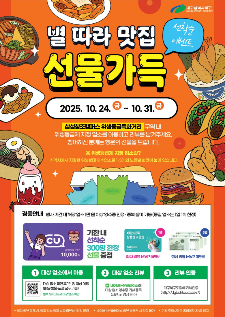 대구 북구보건소가 20일부터 31일까지 위생등급 특화구역을 널리 알리고 지역 상권을 활성화하기 위한 ‘별 따라 맛집, 선물가득 SNS 이벤트’를 진행한다.이번 이벤트는 삼성창조캠퍼스 일대 위생등급 특화구역 내 지정업소를 중심으로 펼쳐지며 ‘퀴즈 이벤트’와 ‘리뷰 이벤트’ 두 가지 형태로 운영된다.먼저 퀴즈 이벤트(20일~23일)는 ‘대구북구맛집’ 홈페이지를 통해 참여할 수 있다.이벤트 기간 동안 퀴즈에 참여하고 ‘대구북구맛집’ 인스타그램을 팔로우한 정답자 중 100명을 추첨해 모바일 상품권(5000원 상당)을 증정한다.이어 리뷰 이벤트(24일~31일)는 위생등급 특화구역 내 지정업소 방문 후 네이버 MY플레이스에 리뷰를 작성하면 참여할 수 있다.경품은 ▲최대 리뷰 등록자 1명 5만 원 ▲우수 리뷰 등록자 5명 3만 원 ▲선착순 300명 1만 원 상당의 모바일 상품권이다.두 이벤트는 중복 참여가 가능하며, 자세한 참여 방법과 지정업소 목록은 ‘대구북구맛집’ 홈페이지에서 확인할 수 있다.이영숙 북구보건소장은 “이번 SNS 이벤트를 통해 시민들이 위생등급 지정업소에 대한 신뢰를 높이고 지역 외식산업의 건강한 발전에 함께할 수 있길 바란다”며 “앞으로도 안전하고 쾌적한 외식 환경 조성을 위해 다양한 프로그램을 추진하겠다”고 밝혔다.
