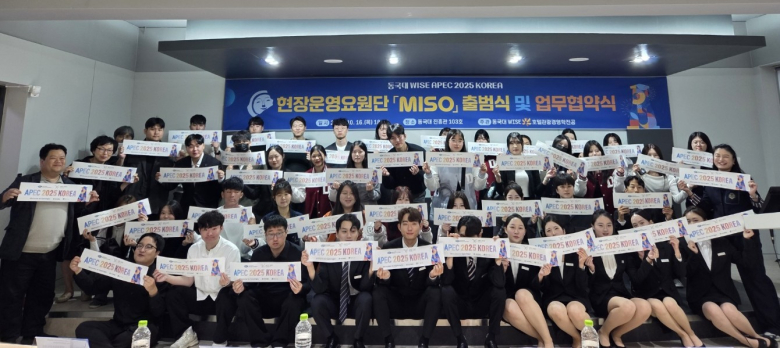 동국대 WISE캠퍼스 호텔관광경영학과는 지난 16일, APEC 2025 KOREA 기간에 배치될 호텔관광 전문 교육을 받은 현장운영요원단 ‘MISO’ 출범식과 함께 관련 기관 및 기업들과 업무 협약식을 가졌다.