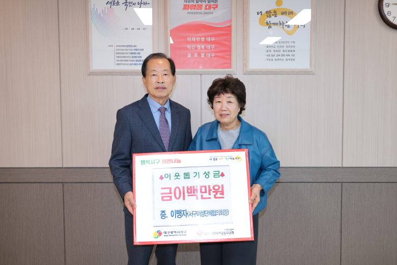 류한국 서구청장은 “늘 지역사회에 봉사와 나눔을 실천해 주시고 따뜻한 마음을 전달해 주셔서 감사드린다”며 “이번 성금이 어려운 이웃들에게 큰 희망이 될 것”이라고 했다.