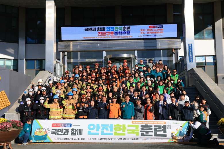 대구 수성구는 27일 대구창의융합교육원과 동산초등학교 강당에서 ‘2025년 재난대응 안전한국훈련’을 진행했다. 이번 훈련은 대규모 재난에 대비한 대응체계 점검과 대응 역량 강화를 위해 범국가적으로 실시되는 프로그램이다.훈련에는 수성구청을 비롯해 수성소방서, 수성경찰서, 501여단3대대, 한국전력공사, 한국가스안전공사, KT, 대한적십자사, 천주성삼병원, 자율방재단 등 22개 기관·단체 관계자와 지역 주민 290여명이 참여했다.올해 훈련은 다중 밀집 시설 화재, 인파 밀집 사고, 싱크홀 발생 등 가상 재난 상황을 설정해 토론훈련과 현장훈련을 병행했다. 특히 동산초등학교 강당을 이재민 임시 주거시설로 지정하고 구호 활동 중심의 훈련을 실시했으며 PS-LTE 재난안전통신망을 활용해 현장과 상황실 간 신속한 교신을 진행했다.