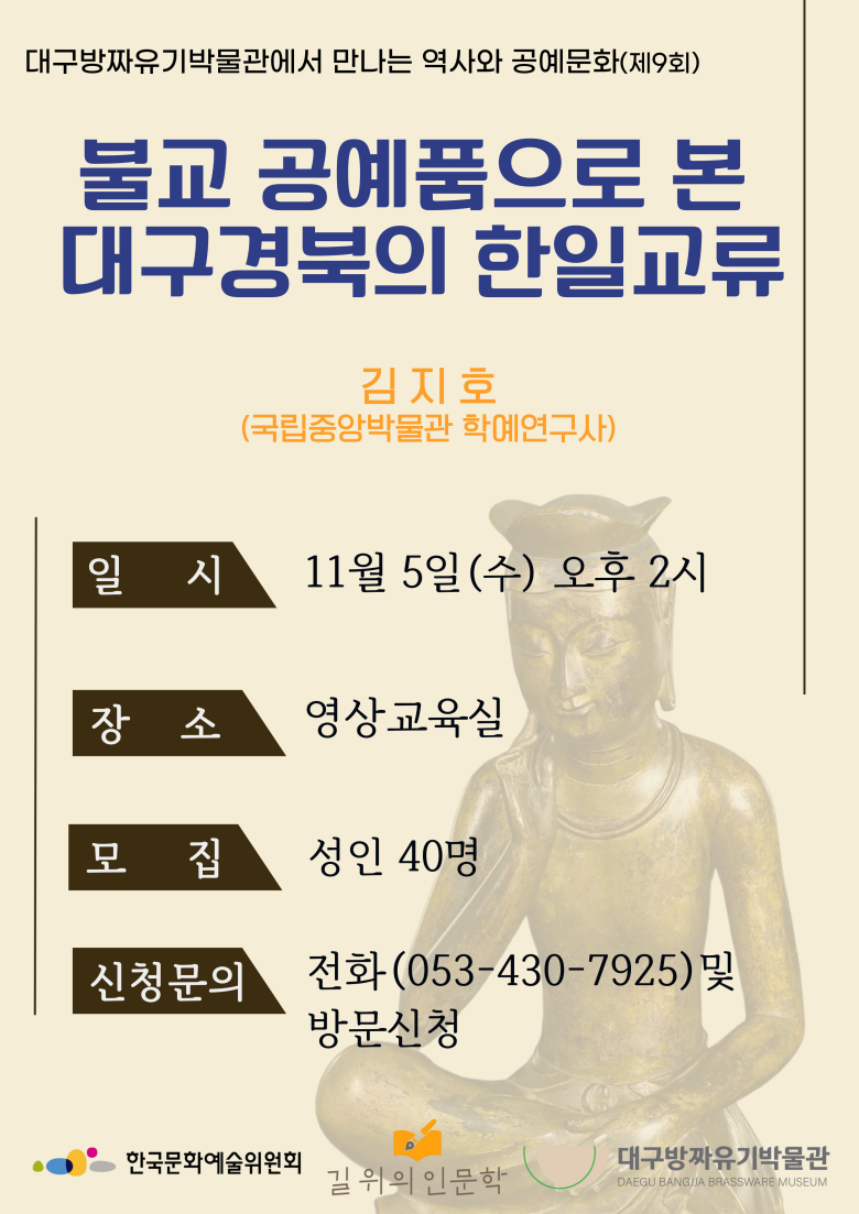 강의에서는 K문화로 주목받고 있는 국립중앙박물관 금동반가사유상을 비롯해 현재 일본에 남아 있는 대구·경북의 불교 공예품과 한일 문화교류에 대해 다각도로 조명할 예정이다. 성인 40명을 모집하며 신청은 29일부터 11월 5일까지 전화로 하거나 방짜유기박물관을 방문해 신청할 수 있다. 잔여석이 있을 경우 당일 현장 신청도 가능하다.신형석 대구문화예술진흥원 박물관운영본부장은 “방짜유기박물관은 우리나라 전통 공예문화와 팔공산 역사를 널리 알려 시민들이 친근하게 찾을 수 있는 대구 동구의 거점 복합문화공간으로 자리매김하고자 한다"며 "많은 관심과 참여를 바란다”고 말했다.