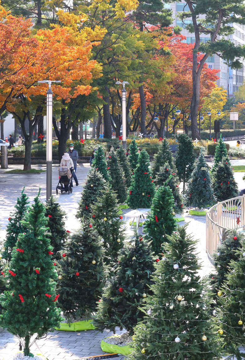29일 인천 남동구 인천시청 앞 애뜰광장에 크리스마스트리가 설치되고 있다. 연합