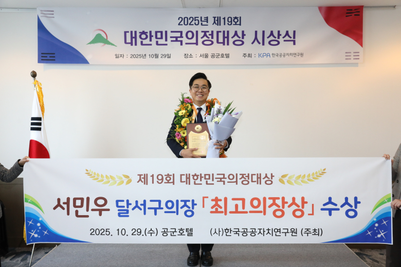 대구 달서구의회 서민우 의장(국민의힘·죽전동·장기동·용산1·2동)이 29일 (사)한국공공자치연구원이 주관한 ‘제19회 대한민국 의정대상’에서 '최고 의장상'을 수상했다.특히 달서구의회는 기관 부문 '종합대상'까지 함께 수상하며 역대 지방의회 최초로 기관상과 최고의장상을 동시에 수상하는 쾌거를 이뤘다.이번 대회는 전국 243개 광역·기초의회와 의원의 활동을 평가해 지역 발전과 국가 경쟁력 향상에 기여한 의회와 의장, 의원을 선정한다.서 의장은 달서구 의회 최연소 의장으로 선출된 이후 ‘젊은 의회, 혁신하는 의회’를 표방하며 청소년 복지 증진, 주민 참여 확대 등 의회 혁신을 선도했다. SNS 등 다양한 채널을 활용한 의정 홍보, 주민 편익시설 설치, 지역 현안 해결 등 현장 중심 활동도 높은 평가를 받았다.또 성서소각장 주민지원협의체 위원장으로 활동하고 직원 교육과 조직문화 개선을 통해 활력 있는 의회 운영에도 힘쓰며 내부 활동까지 두루 인정받았다.서 의장은 “청년 의장으로서 젊음과 혁신의 가치를 의회에 담아내기 위해 동료 의원들과 노력해 왔다”며 “이번 수상은 달서구의회 전체가 한마음으로 이뤄낸 성과이며, 앞으로도 구민과 소통하며 실질적 변화를 만들어가겠다”고 소감을 밝혔다.이번 평가 과정에서는 공적서 심사, 주민·공무원 만족도 조사, 실사 인터뷰, 최종 심사 등을 거쳐 수상자가 결정됐다. 달서구의회는 기관 부문 종합대상과 의장상을 동시에 수상하며 명실상부 대한민국 지방자치단체 최고 의정기관으로서 대내외 인정을 받았다.
