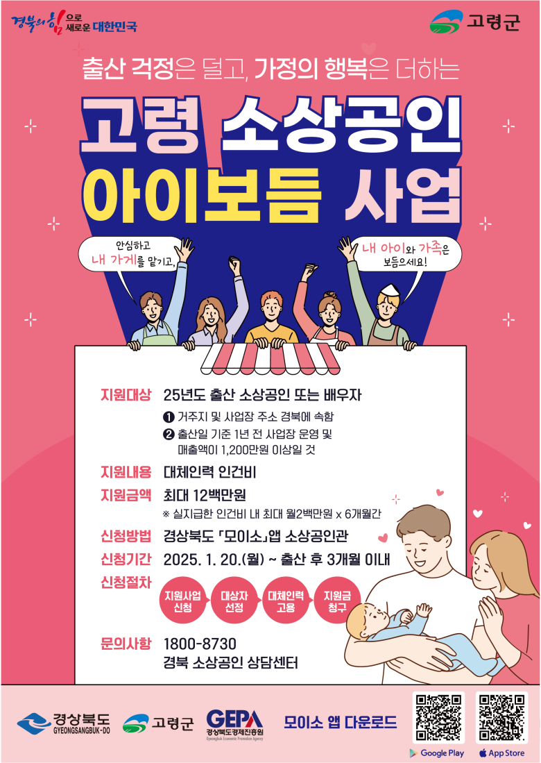 고령군은 출산과 육아로 인해 사업 경영에 어려움을 겪는 소상공인의 경제적 부담을 덜어주기 위해 ‘2025 소상공인 출산장려 아이보듬 지원사업’을 추진 중인 바, 경기 침체 지속과 인구 유출, 저출생 등의 여파로 인해 사업 신청률이 저조함에 따라 재차 신청을 독려한다고 밝혔다. 본 사업은 출산 소상공인의 경영 공백을 줄이기 위해 출산 후 월 200만원씩, 최대 6개월간 대체인력에 대한 인건비를 지원하는 것으로 현재 경상북도 경제진흥원에서 위탁 수행 중이다. 신청 대상은 ▲2025년 출산 소상공인 본인 또는 그 배우자 ▲거주지 및 사업장 주소 모두 경북 소재 ▲출산일 기준 1년 전 사업장 운영 ▲전년도(2024년) 연 매출 1200만 원 이상일 경우 지원받을 수 있다. 사업 신청은 11월 말까지 경상북도 ‘모이소’ 앱을 통해 진행되며 예산 소진 시 접수는 조기 종료될 수 있다. 자세한 사항은 경상북도경제진흥원 누리집(www.gepa.kr)을 통해 확인할 수 있으며 기타 관련 문의는 경북 소상공인 상담센터(1800-8730)로 하면 된다.