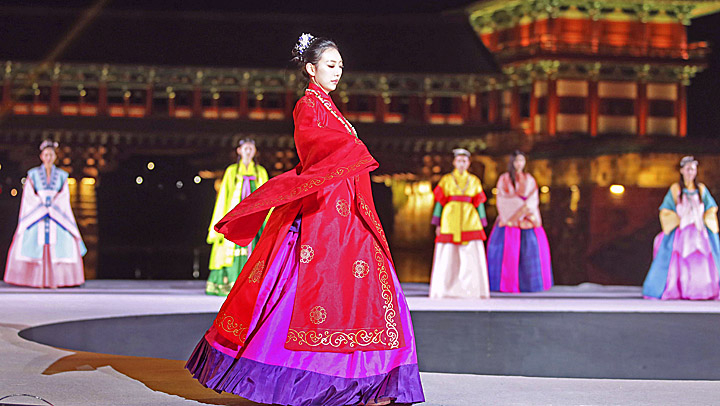 29일 오후 경북 경주시 월정교 특설무대에서 열린 2025년 APEC 정상회의 한복패션쇼에서 모델들이 다양한 한복을 선보이고 있다. 연합