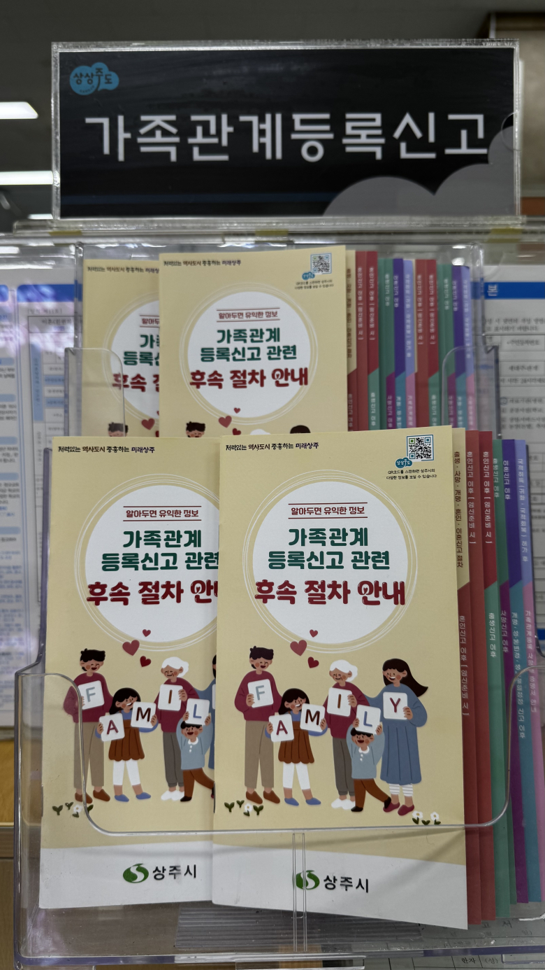 상주시는 시민들이 생애주기별로 겪게 되는 가족관계 관련 후속 절차들을 보다 쉽고 명확하게 이해하고 처리할 수 있도록 ‘가족관계등록 후속절차 안내문’을 제작, 시청 종합민원실 및 각 읍면동 행정복지센터 민원실에 시민 편의 증진을 위해 비치하고 시 홈페이지에도 게시할 예정이다. 이번 안내문은 출생, 혼인, 사망, 개명 등 가족관계등록 신고시 필요한 행정절차와 지원 제도를 상세하게 담아 시민들의 궁금증을 해소하고 어떤 절차에 따라 어느 기관을 방문해서 일을 처리할지에 대한 도움을 제공하고자 안내문을 제작하게 됐다. 강영석 상주시장은 “가족관계등록 신고 후 처리해야 할 일들에 대해 어려움을 겪는 시민들의 불편을 해소하는데 후속 절차 안내문이 도움 되길 바라며 앞으로도 시민들의 행정 서비스 접근성을 높이는 등 수요자 중심의 맞춤형 행정서비스를 제공해 행복한 상주시가 되도록 최선을 다하겠다”고 했다.