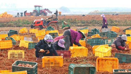 31일 인천 강화군 한 밭에서 농민들이 고구마를 수확하고 있다. 연합