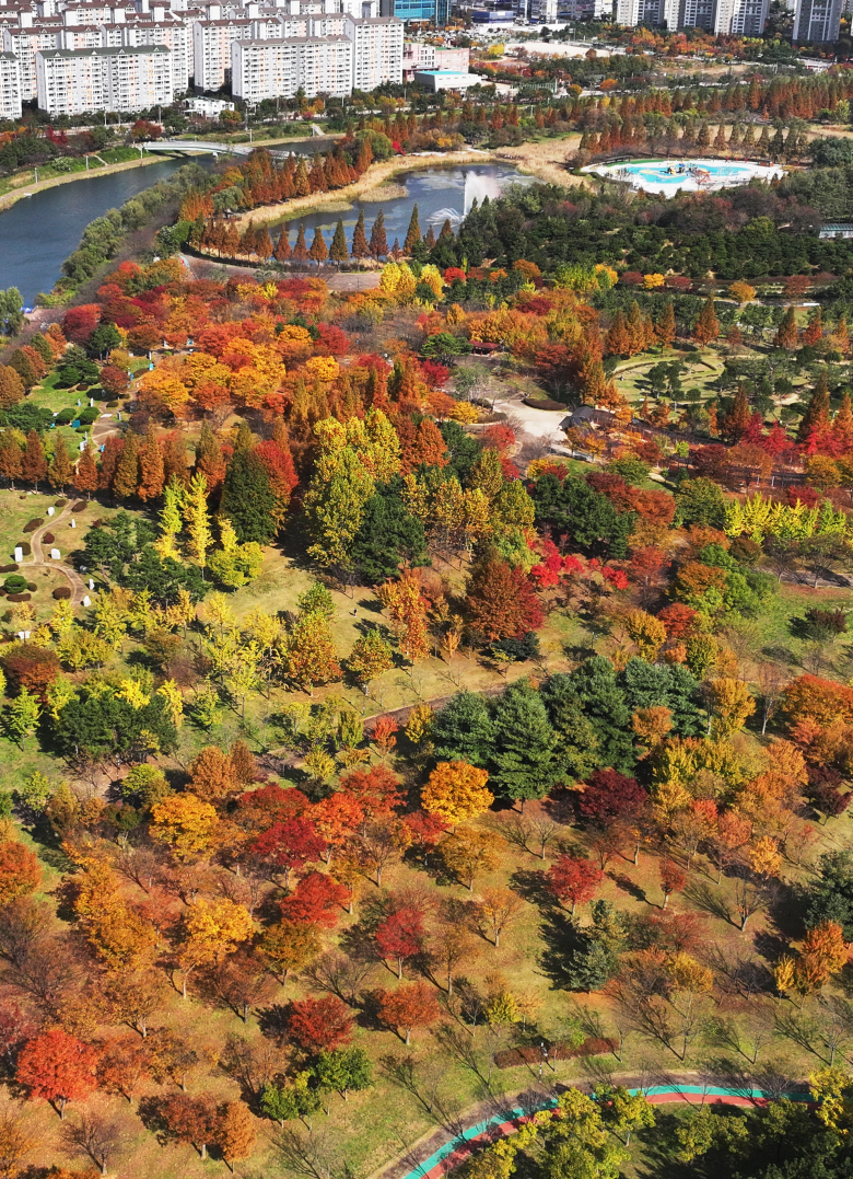 북쪽의 찬 공기가 남하하며 쌀쌀한 날씨를 보인 2일 경기도 안산시 상록구 안산호수공원에 단풍이 물들어 있다. 연합