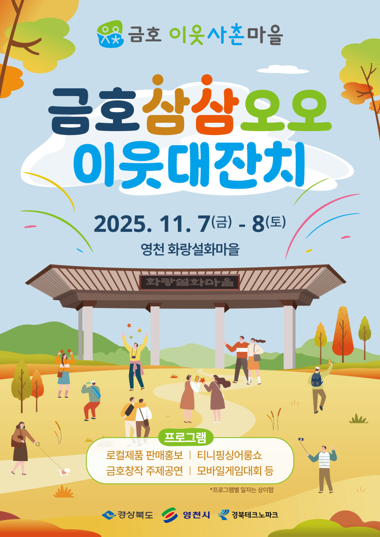 경상북도와 영천시가 주최하고 (재)경북테크노파크가 주관하는 ‘제3회 금호삼삼오오 이웃대잔치’가 오는 7일부터 8일까지 이틀간 화랑설화마을에서 열린다.이번 행사는 금호 이웃사촌마을 조성사업의 일환으로 ‘청년의 미래와 동행하는 도시 금호’를 주제로 열린다. 새롭게 지역에 정착한 청년들과 금호 주민들이 문화와 예술, 관광이 어우러진 다채로운 프로그램을 통해 함께 어울리며 화합하는 축제 한마당으로 마련됐다.축제 현장은 청년 창업인과 지역민, 가족 단위 방문객이 세대 간 소통과 상생의 의미를 나누는 자리가 될 예정이다.