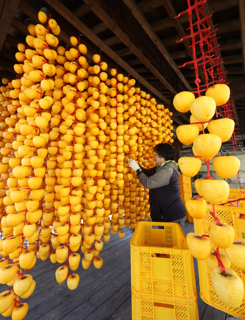 입동(7일)을 이틀 앞둔 5일 강원 강릉시 구정면의 한 농가에서 주민들이 곶감을 만드느라 분주하다. 연합