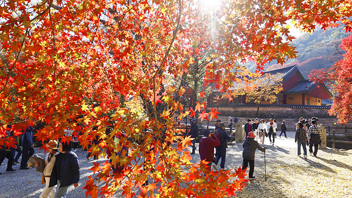 11일 전남 장성군 내장산국립공원 백양사를 찾은 나들이객들이 단풍나무 주위를 거닐며 가을을 만끽하고 있다. 연합