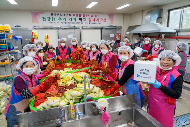 한국생활개선경북도연합회가 13일 경북도농업기술원 농산물가공지원센터에서 경북 북부 산불과 침수 피해를 본 지역의 회원을 돕고자 김장 나눔 행사를 진행했다.이번 김장 나눔 행사는 재난 피해 회원들이 조속히 생업 복구에 집중하고 대부분 임시주택에 거주하고 있어 겨울철 식탁의 주요 반찬인 김장을 하기 어려운 상황을 고려해 지난 5월 반찬 봉사에 이어 회원들이 다시 한번 마음을 모아 온정을 전한 것이다.이날 생활개선회 도 임원과 시군 회장들은 지역 농산물로 준비한 배추, 무, 양념으로 김장 김치 500여 포기를 정성스럽게 담그고, 200여 가구에 전달해 따뜻한 이웃사랑을 실천했다.특히, 한국생활개선경상북도연합회는 지난 4월에도 피해 회원과 도민을 돕기 위해 성금 모금활동을 전개해 회원가정과 사회복지공동모금회에 1억원 상당의 성금과 생활용품을 전달하는 등 꾸준히 나눔 활동을 이어오고 있다.조영숙 경북도농업기술원장은 “생활개선회원은 농촌의 어려운 현장에서 가장 먼저 손을 내밀며 따뜻한 이웃사랑을 실천해 왔다”며 감사의 뜻을 표하고 “앞으로도 농업인의 따뜻한 정과 서로 돕는 농촌 문화를 이어가는 데 적극 지원하겠다”고 말했다.
