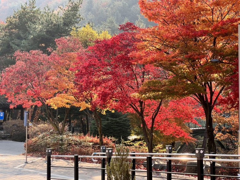 숲속의 광장은 책을 읽거나 차 한잔을 즐기기에 좋은 공간이다. 창문 너머로는 단풍이 든 휴양림의 풍경이 한눈에 들어와 계절의 아름다움을 느낄 수 있으며 탁 트인 전망 덕분에 숲속에서 보내는 시간이 더욱 특별하게 다가온다.