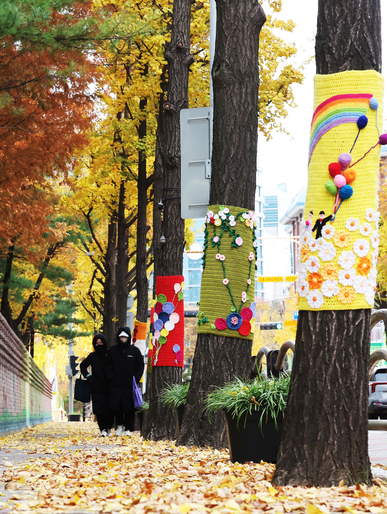 북쪽에서 찬 공기가 유입되며 추위가 찾아온 17일 경기도 광명시의 한 거리에서 두꺼운 옷차림의 시민들이 뜨개옷 입은 가로수길을 걷고 있다. 연합