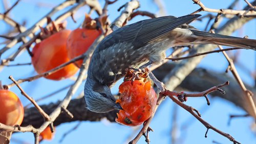 17일 강원 강릉시 초당동의 한 감나무에서 직박구리가 까치밥을 먹고 있다. 연합