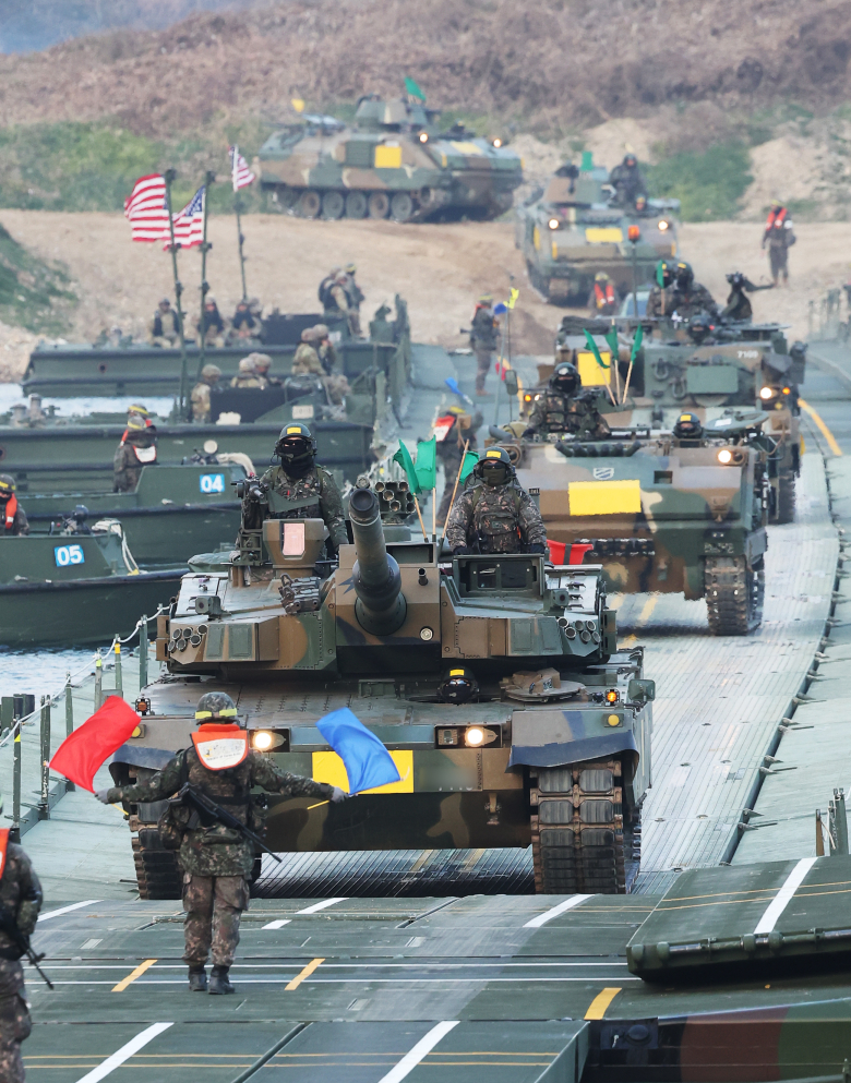 '2025 호국훈련'이 진행 중인 20일 경기도 여주시 연양동 남한강에서 열린 '한미 연합 도하 훈련'에서 육군 제11기동사단 K2 전차가 육군 제7공병여단, 미2사단/한미연합사단 예하 다목적 교량중대 함께 구축한 부교를 도하하고 있다. 연합