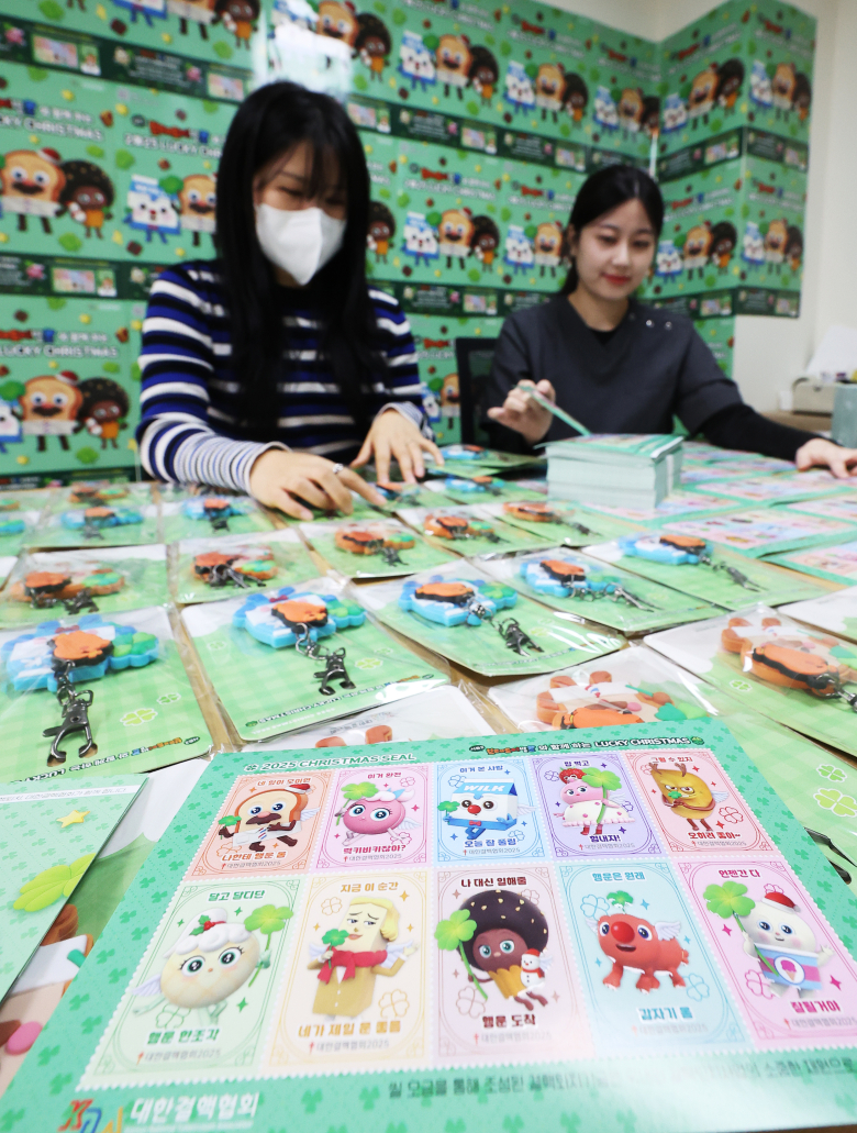 24일 경기도 수원시 팔달구 대한결핵협회 경기도지부에서 직원들이 2025년도 크리스마스 씰을 보여주고 있다. 연합