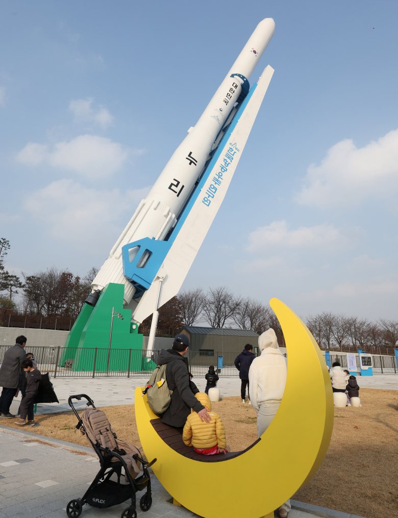 30일 과천 국립과천과학관을 찾은 시민들이 누리호에 대한 설명을 들으며 누리호 모형 기립 모습을 지켜보고 있다. 연합