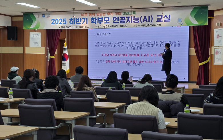 상주교육지원청은 지난달 27일 지역 학부모를 대상으로 ‘2025 하반기 학부모 AI교실’을 개최했다. 이번 연수는 4차 산업혁명 시대의 변화에 대응하는 학부모의 인공지능(AI) 기술에 대한 이해도 향상과 부모-자녀 간 디지털 소통 격차를 해소하기 위해 마련됐다. 이날 연수에는 지역 유치원 및 각급학교 학부모 희망자 30명 내외가 참여하여 교육현장에서의 AI활용 이해도를 높이는 시간을 가졌다. 강의는 남산중학교 진광훈 교사가 ▲AI의 기본개념 ▲교육현장에서의 활용 사례 ▲학생들의 미래역량과 AI교육 방향 등을 PPT자료로 설명했다. 이어지는 체험시간에는 학부모들이 생성형 AI를 직접 사용해보는 실습을 통해 AI기술이 실생활 및 자녀교육에서 어떻게 활용될 수 있는지 경험해보는 기회를 가졌다. 김종현 교육장은 “이번 학부모 AI교실이 가정과 학교가 함께 AI 시대의 교육 흐름을 이해하는 데 큰 도움이 되길 바란다”며 “앞으로도 학부모와 학생이 함께 미래교육을 준비할 수 있도록 지원을 아끼지 않겠다”고 했다.