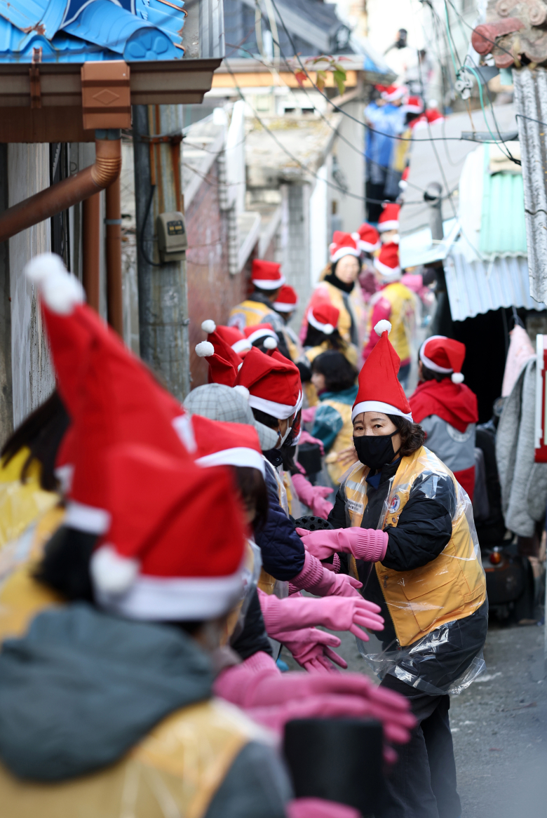 고려아연 임직원 및 적십자봉사원이 2일 서울 노원구 상계동에서 취약계층 가정에 연탄을 전달하고 있다. 연합