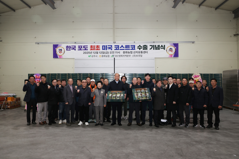 상주시 중화농협은 지난 12일 화서면 중화농협 농산물산지유통센터에서 ‘중화농협 샤인머스캣 미국 수출 선적식’을 개최했다. 이번 수출 선적은 중화농협이 미국 대형 유통망인 코스트코(Costco)와 체결한 수출 계약에 따른 것으로 40피트 컨테이너 22대 규모(총 16억 원 상당)의 대형 성과이다. 해당 물량은 11월 중순부터 순차적으로 선적돼 12월까지 미국 현지 코스트코 매장에 공급되며 이는 상주 샤인머스캣의 품질 경쟁력과 안정적 수출 인프라 기반 확충을 다시금 입증한 사례로 평가된다. 이뿐만 아니라 중화농협은 샤인머스캣 수출을 통해 2025년 연간 수출액 300만 달러를 최초로 돌파하는 성과를 거뒀다. 이는 상주 포도 수출 역사상 큰 의미가 있는 기록으로 지속적인 품질 고급화와 해외시장 맞춤형 전략이 포도처럼 달콤한 결실을 맺은 결과로 분석된다. 상주시 관계자는 “이번 미국 수출 성과는 농가와 농협, 수출업체와 행정이 함께 만든 결과”라며 “앞으로도 샤인머스캣을 포함한 상주 포도의 수출 경쟁력을 더욱 높일 수 있도록 행정·재정적 지원을 강화해 나가겠다”고 했다.