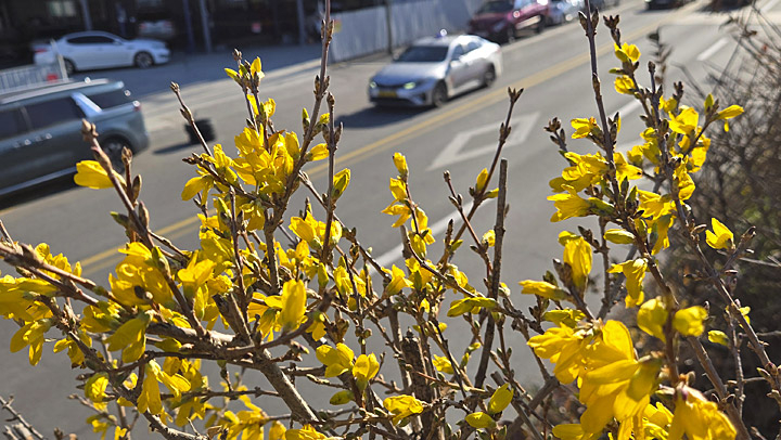 15일 강원 강릉시 입암동 도로변에 봄의 전령사로 불리는 개나리가 활짝 펴 눈길을 끌고 있다. 연합