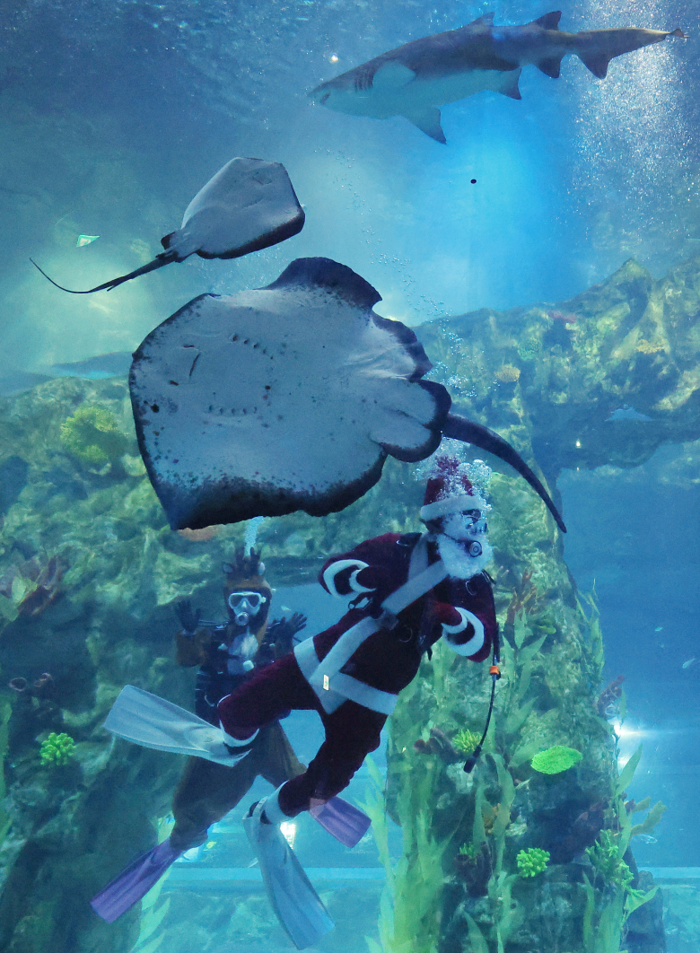 16일 서울 송파구 롯데월드 아쿠아리움 메인수조에서 산타와 루돌프 복장을 한 아쿠아리스트들이 공연을 하고 있다. 연합