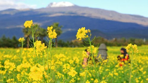 16일 오전 제주 서귀포시 남원읍 휴애리 자연생활공원을 찾은 입장객이 유채꽃밭에서 겨울 제주의 정취를 즐기고 있다. 연합