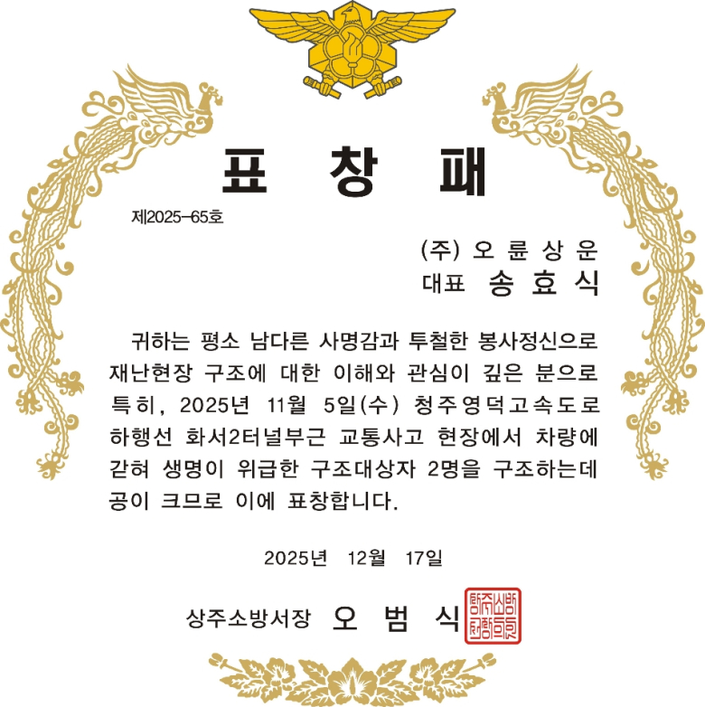 상주소방서는 고속도로 교통사고 구조현장에서 소중한 생명을 보호하는데 이바지한 민간인 유공자 1명(오륜상운 송효식 대표)에게 표창패를 수여했다. 이번 수상자는 지난달 5일 오후 8시 3분경 청주영덕고속도로 하행선 화서2터널 부근 차대차(5톤대25톤) 교통사고 현장에서 25톤 트럭 내 구조대상자 2명을 발견하고 화물차량과 쇠사슬(로프)을 이용해 붙어 있는 트럭을 떨어트려 조수석 등에 끼여 생명이 위급한 구조대상자를 신속히 구조 및 병원으로 이송하는 데 큰 역할을 했다는 공로를 인정받았다.