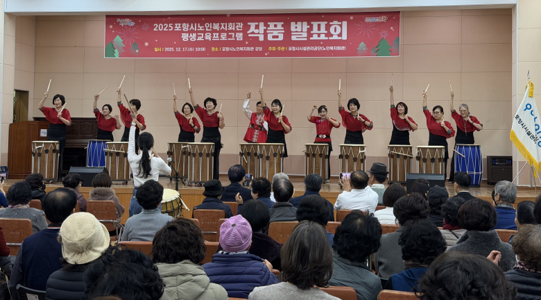 포항시시설관리공단 노인복지회관이 어르신들의 한 해 배움의 결실을 무대와 전시로 선보이며 지역사회에 따뜻한 울림을 전했다.포항시시설관리공단 노인복지회관은 17일 평생교육프로그램과 동아리 활동에 참여한 어르신들을 대상으로 작품 발표회를 개최했다. 이날 행사에는 약 200명의 관객이 참석해 어르신들의 열정 가득한 무대에 박수와 응원을 보냈다.작품 발표회에는 난타, 가곡교실, 통기타, 아코디언, 우쿨렐레, 댄스스포츠 등 14개 과목이 참여해 그동안 갈고닦은 실력을 무대 위에서 선보였다. 어르신들은 음악과 율동이 어우러진 공연으로 배움의 즐거움과 도전의 의미를 관객들과 함께 나눴다.이와 함께 열린 작품 전시회는 오는 19일까지 노인복지회관 본관 1~3층 로비에서 진행된다. 서예, 문인화, 민화, 수채화, 유화, 한지공예 등 6개 부문에서 총 150점의 작품이 전시돼 방문객들의 발길을 끌고 있다.전시 작품들은 어르신들의 창의성과 꾸준한 노력이 고스란히 담긴 결과물로, 평생학습을 통해 삶의 활력을 되찾은 모습을 엿볼 수 있다는 평가다.행사에 참여한 한 어르신은 “그동안 갈고 닦은 실력을 마음껏 발휘할 수 있어 행복했다”며 “무대에 서니 다시 젊어진 기분이 들었다”고 말했다.노인복지회관 관계자는 “이번 발표회와 전시회는 어르신들이 배움을 통해 성장해 온 과정을 함께 나누는 뜻깊은 자리”라며 “앞으로도 어르신들의 활기찬 노후와 문화·여가 활동 활성화를 위한 평생교육프로그램을 지속적으로 운영하겠다”고 밝혔다.