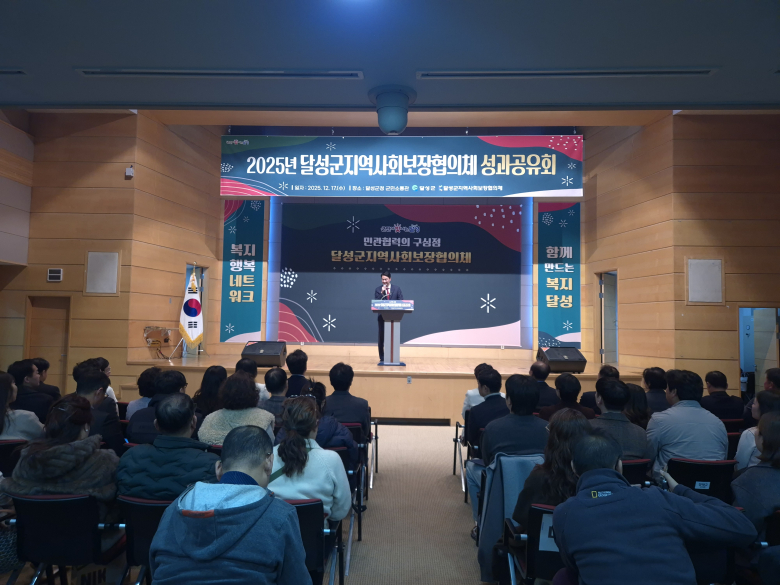 대구 달성군이 17일 군청 군민소통관에서 ‘2025 지역사회보장협의체 성과공유회’를 열고 한 해 동안 추진해 온 지역복지 활동의 성과를 공유했다.이날 행사에는 최재훈 달성군수와 김은영 달성군의회 의장, 김중구 달성군 지역사회보장협의체 민간위원장을 비롯해 군·읍면 협의체 위원 등 200여 명이 참석했다.성과공유회는 달성군 지역사회보장협의체의 2025년 주요 사업과 성과를 되돌아보고 지역복지 발전에 기여한 유공자를 격려하며 지역 특성에 맞는 특화 복지사업을 확산하기 위해 마련됐다.행사는 연간 활동 영상 상영을 시작으로 지역복지 증진 유공자 표창, 특화사업 우수사례 시상 및 발표 순으로 진행됐다. 협의체 활성화에 기여한 위원 8명과 나눔 문화 확산에 앞장선 후원업체 2곳이 표창을 받았으며, 창의적이고 실효성 있는 지역 맞춤형 복지사업을 추진한 노인분과와 가창면 지역사회보장협의체가 최우수상을 수상했다.김중구 민간위원장은 “이번 성과공유회는 한 해를 마무리하는 자리가 아니라 내년도 복지 발전을 위한 출발점”이라며 “현장의 목소리를 반영한 촘촘한 복지 서비스를 구현하겠다”고 말했다.최재훈 군수는 “지역복지를 위해 헌신한 위원과 유공자들에게 감사드린다”며 “민관 협력 복지 체계를 더욱 강화해 군민 모두가 체감하는 행복한 달성을 만들어가겠다”고 밝혔다.