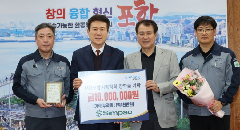 ㈜SIMPAC(부회장 송효석)이 지역 인재 육성과 교육 지원을 위해 장학금 1000만 원을 기탁했다. 이번 기탁으로 ㈜SIMPAC의 포항시장학회 누적 기부액은 총 1억4000만 원에 이르렀다.송효석 부회장은 지난 18일 포항시장학회를 방문해 장학금을 전달하며, 지역 학생들의 학업 정진과 미래 성장을 응원하는 뜻을 전했다. 이번에 기탁된 장학금은 지역 인재 양성과 포항지역 학생들의 안정적인 학업 지원을 위해 활용될 예정이다.㈜SIMPAC은 매년 꾸준한 장학금 기탁을 통해 지역사회와의 상생을 실천해 온 기업으로, 지속적인 사회환원 활동을 이어오고 있다.송효석 부회장은 “지역사회와 함께 성장해 온 기업으로서 지역 인재 양성에 조금이나마 보탬이 되기를 바란다”며 “앞으로도 기업의 사회적 책임을 다하는 다양한 나눔 활동을 이어가겠다”고 밝혔다.이강덕 포항시장학회 이사장은 “오랜 기간 변함없이 장학사업에 동참해 준 ㈜SIMPAC에 깊이 감사드린다”며 “기탁해 주신 장학금은 지역 학생들이 꿈을 키우고 미래를 준비하는 데 소중히 사용하겠다”고 말했다.