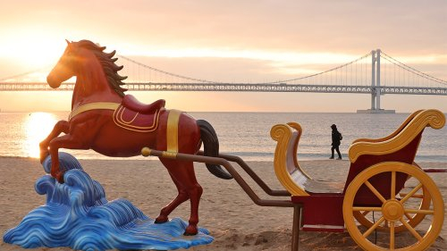 19일 오전 부산 수영구 광안리해수욕장에 새해 2026년 병오년 붉은 말의 해를 맞아 말 모양의 새해 조형물이 설치됐다. 연합