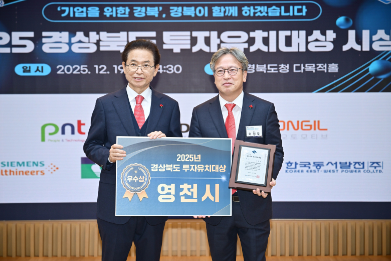 영천시는 지난 19일 경상북도청에서 열린 ‘2025년 경상북도 투자유치대상 시상식’에서 우수상을 수상했다고 밝혔다.이번 시상식은 경상북도가 지난 1년간(2024년 11월 ~ 2025년 10월) 도내 시·군의 투자유치 활동 실적을 평가하고 투자유치에 기여한 기업과 시·군을 격려하기 위해 마련됐다.영천시는 해당 기간 동안 기업 투자유치를 위한 행정 지원과 유치 활동을 추진했으며 ㈜카펙발레오와 1600억원 규모의 투자양해각서를 체결하는 등 의미 있는 투자유치 성과를 기록했다. 이러한 실적과 함께 일자리 창출과 투자유치 시책 운영 등이 종합적으로 평가돼 우수상 수상으로 이어졌다.이로써 영천시는 2023년부터 2025년까지 3년 연속 경상북도 투자유치대상 시상식에서 수상하며 꾸준한 투자유치 성과를 이어가고 있다.시 관계자는 “이번 수상을 계기로 앞으로도 투자유치와 일자리 창출을 위한 노력을 지속해 나가겠다”고 밝혔다.영천시는 앞으로도 지속적인 투자유치 활동을 통해 지역 산업 기반을 확대하고 양질의 일자리 창출과 지역 경제 활성화를 위해 힘쓸 계획이다.