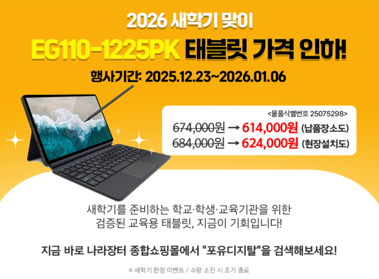 이번 프로모션 대상 모델인 EG110-1225PK(MT8791)는 나라장터 종합쇼핑몰을 통해 12월 23일부터 2026년 1월 6일까지 특별한 가격에 공급된다. 제품별 혜택은 ▲납품장소도 기준 770,000원에서 614,000원으로 ▲현장설치도 기준 780,000원에서 624,000원으로 단독 할인 혜택이 적용된다.포유디지탈의 EG110 시리즈는 교육 현장의 니즈를 완벽히 반영한 고성능 사양을 자랑한다. 자이로 센서를 내장하여 VR(가상현실) 및 AR(증강현실) 등 실감형 교육 콘텐츠를 생생하게 체험할 수 있으며, 2K IPS 초고화질 디스플레이(2,000x1,200)와 10포인트 멀티 터치 기능을 통해 몰입감 있는 학습 경험을 선사한다. 또한 Widevine DRM L1 보안 등급과 1,300만 화소 고화질 카메라, 효율적인 기기 관리를 위한 MDM 스마트 관리 시스템을 모두 지원한다.환경까지 생각한 녹색제품 인증 단말기인 EG110은 사용 환경에 따라 노트북과 태블릿 모드를 오가는 유연한 설계를 갖춰, 필기·드로잉·코딩 등 창의 융합형 수업에서 탁월한 활용성을 보여준다.최우식 대표이사는 “기술의 발전은 특정 계층을 넘어 누구나 누릴 수 있는 보편적 가치가 되어야 한다”며, “광주광역시의 호남지사와 창원시의 영남지사 등 전국 단위 서비스 네트워크를 통해 신속한 현장 대응 체계를 완성한 만큼, 이번 프로모션을 통해 더 많은 교육 현장에 미래형 디지털 인프라가 성공적으로 안착하기를 기대한다”고 밝혔다.이번 새학기 응원 프로모션은 한정 수량으로 진행되어 물량 소진 시 조기에 종료될 수 있다. 구매를 희망하는 학교 및 교육기관은 나라장터 종합쇼핑몰에서 모델명(EG110-1225PK)이나 물품식별번호(25075298)를 검색하여 상세 혜택을 확인할 수 있다.
