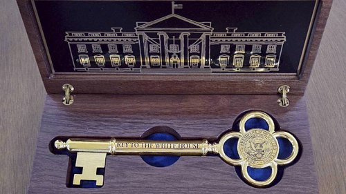 트럼프 대통령이 지난 16일 강경화 주미대사와의 환담에서 5개 제작된 백악관 황금 열쇠 중 마지막 남은 1개를 우리 대통령에게 선물했다. 강훈식 대통령비서실장 SNS 캡처