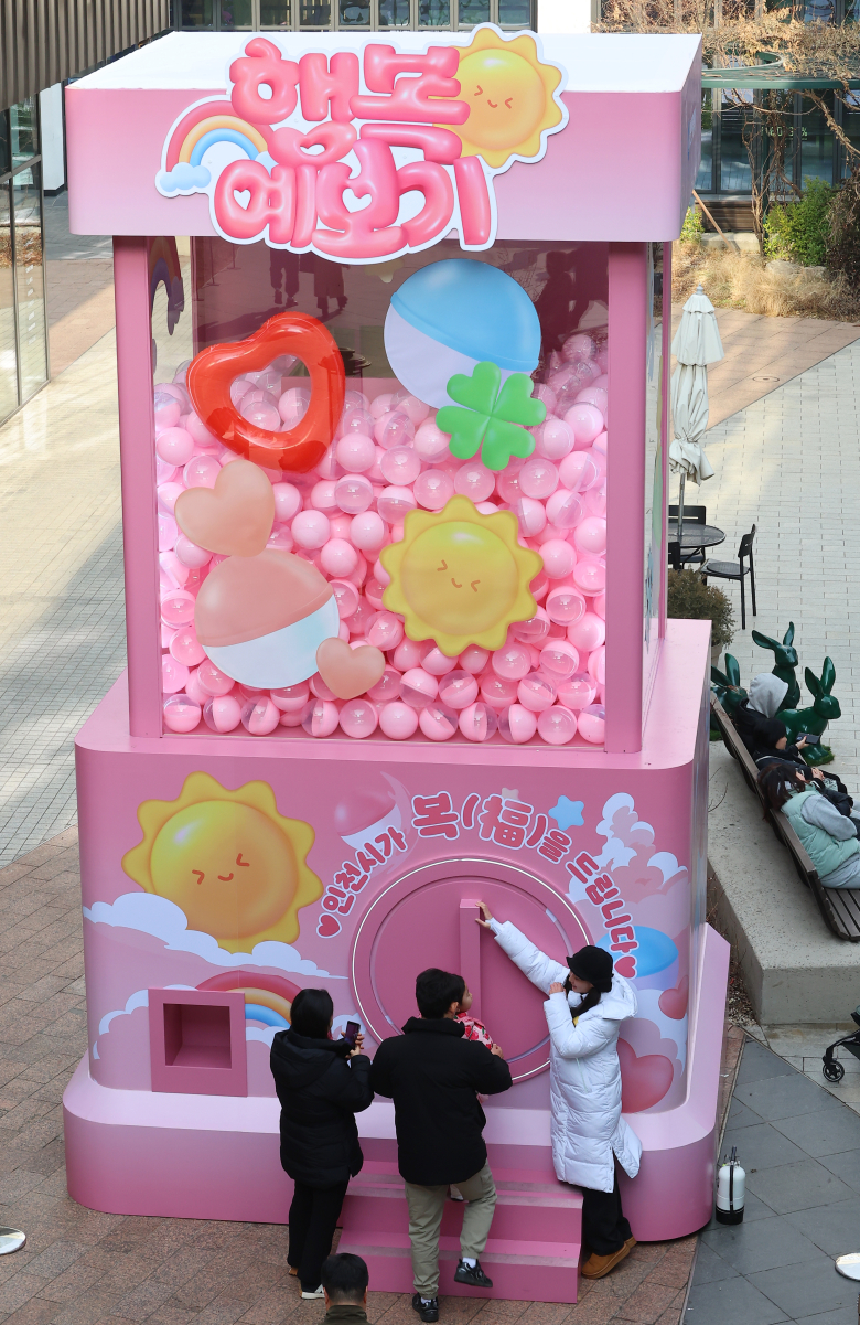 28일 인천 연수구 한 쇼핑몰에 설치된 6m 초대형 뽑기 기계인 '2026년 행복 예보기'에서 시민들이 행복 예보 카드가 들어 있는 캡슐을 뽑고 있다. 연합