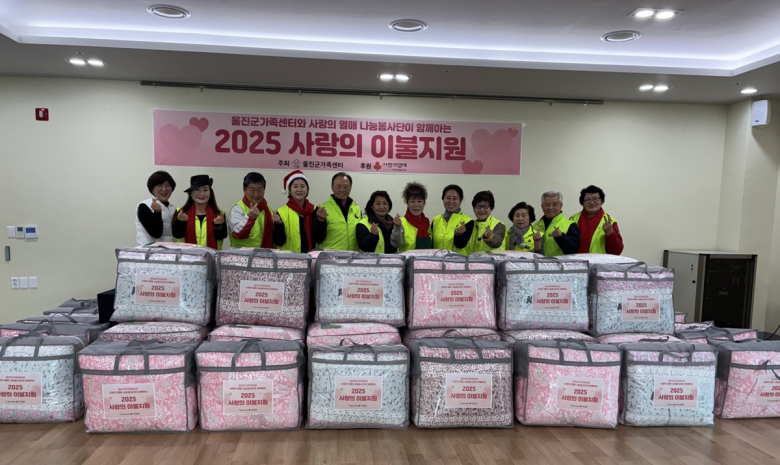 울진군은 지난달 29일 울진군 가족센터와 사랑의 열매 나눔봉사단(단장 백정례)이 함께하는 사랑의 이불 지원 전달식을 진행했다.이번 전달식은 사랑의 열매 나눔봉사단이 2025년 경북 사랑의 열매 유공 우수 봉사단으로 선정되면서 받은 시상금(540만원)으로 구입한 이불을 다문화가정 54가정에 전달했다.이번 ‘사랑의 이불 지원사업’은 안정적인 정착을 돕는 생활 밀착형 지원으로 다문화가정의 지역 정착과 사회 통합에도 긍정적인 역할을 할 것으로 기대된다.백정례 사랑의 열매 나눔봉사단 단장은 “올겨울은 기온 변동성과 한파 가능성이 예보되고 있어 취약계층의 겨울나기 부담이 더욱 클 것으로 예상 된다”며 “이번 이불 나눔 사업이 다문화가정에 단순한 물품 지원을 넘어 따뜻한 관심과 응원의 메시지로 전달되길 바란다”고 전했다.울진군 관계자는 “앞으로도 민관이 협력하는 다양한 나눔 사업을 통해 취약계층과 다문화가정이 지역사회 안에서 안정적으로 정착할수 있도록 지속적인 지원을 이어가겠다”고 밝혔다.
