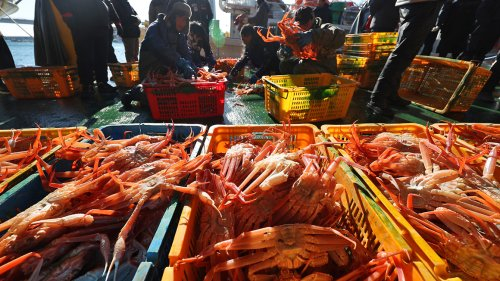 2일 경북 영덕군 강구항에서 열린 새해 첫 대게 경매에서 작업자들이 게를 분류하고 있다. 연합