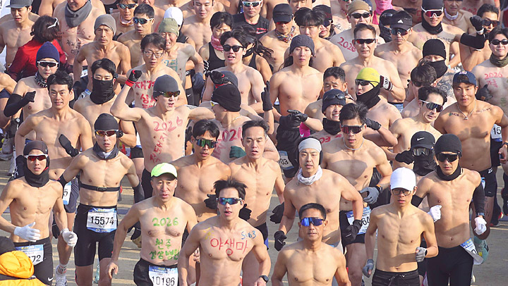 4일 대구시 두류공원 2.28 자유 광장에서 열린 2026 전국새해 알몸 마라톤대회에서 참가자들이 가족의 건강 등 새해 소원을 몸에 새기고 힘찬 출발을 하고 있다. 연합